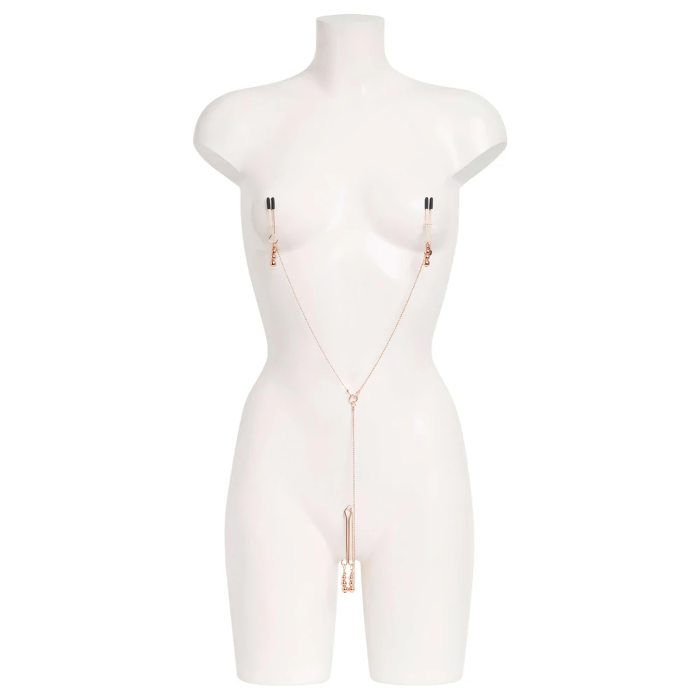 Ez a klitorisz- és mellbimbódísz lánccal összekötve fájdalommentes, csupán egy kis szorító érzéssel képes fokozni az élvezetet.
