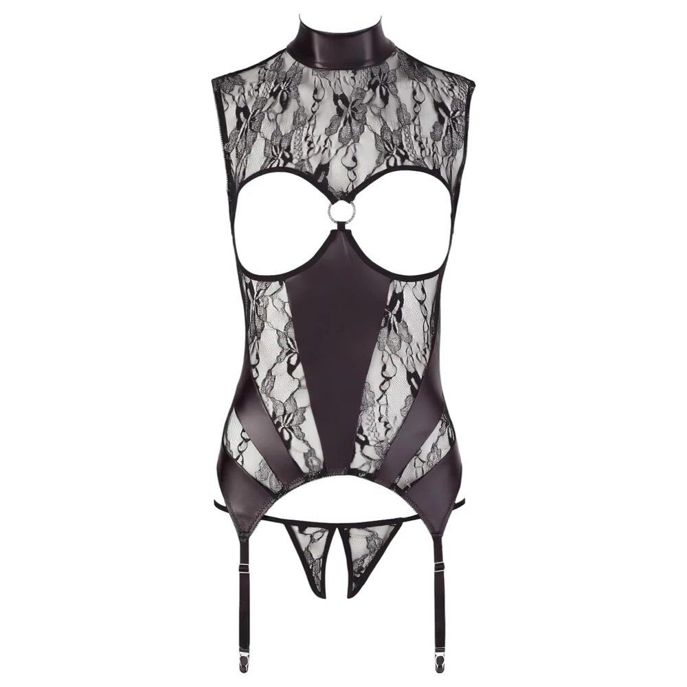A nyitott melltartórész kihívó és érzéki megjelenést biztosít, miközben az állógallér eleganciát és kifinomultságot sugároz. A nagy strasszköves gyűrű különleges és izgalmas látványelemet ad, az állítható harisnyatartó pántok pedig gondoskodnak a testreszabható illeszkedésről. A szett része a szeméremnél nyitott tanga, amely tovább fokozza a csábítást.
