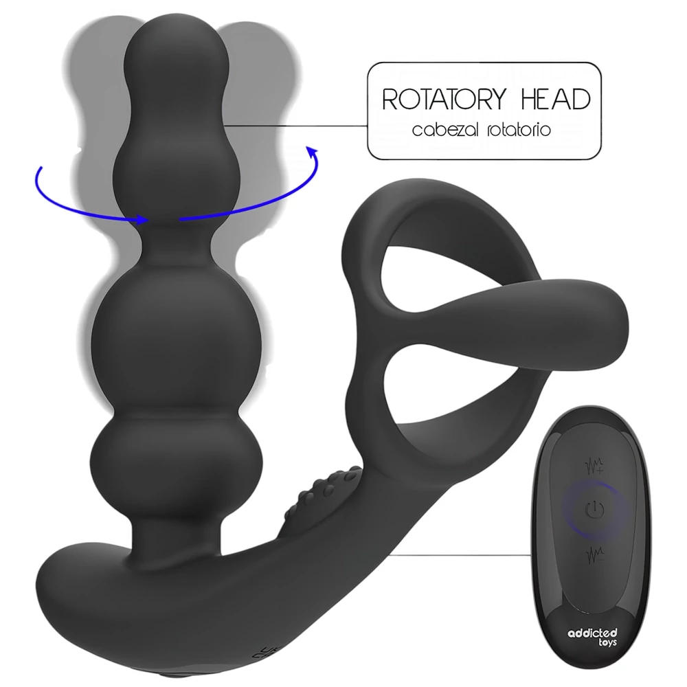 Addicted Toys - forgó fejes análvibrátor péniszgyűrűvel (fekete)