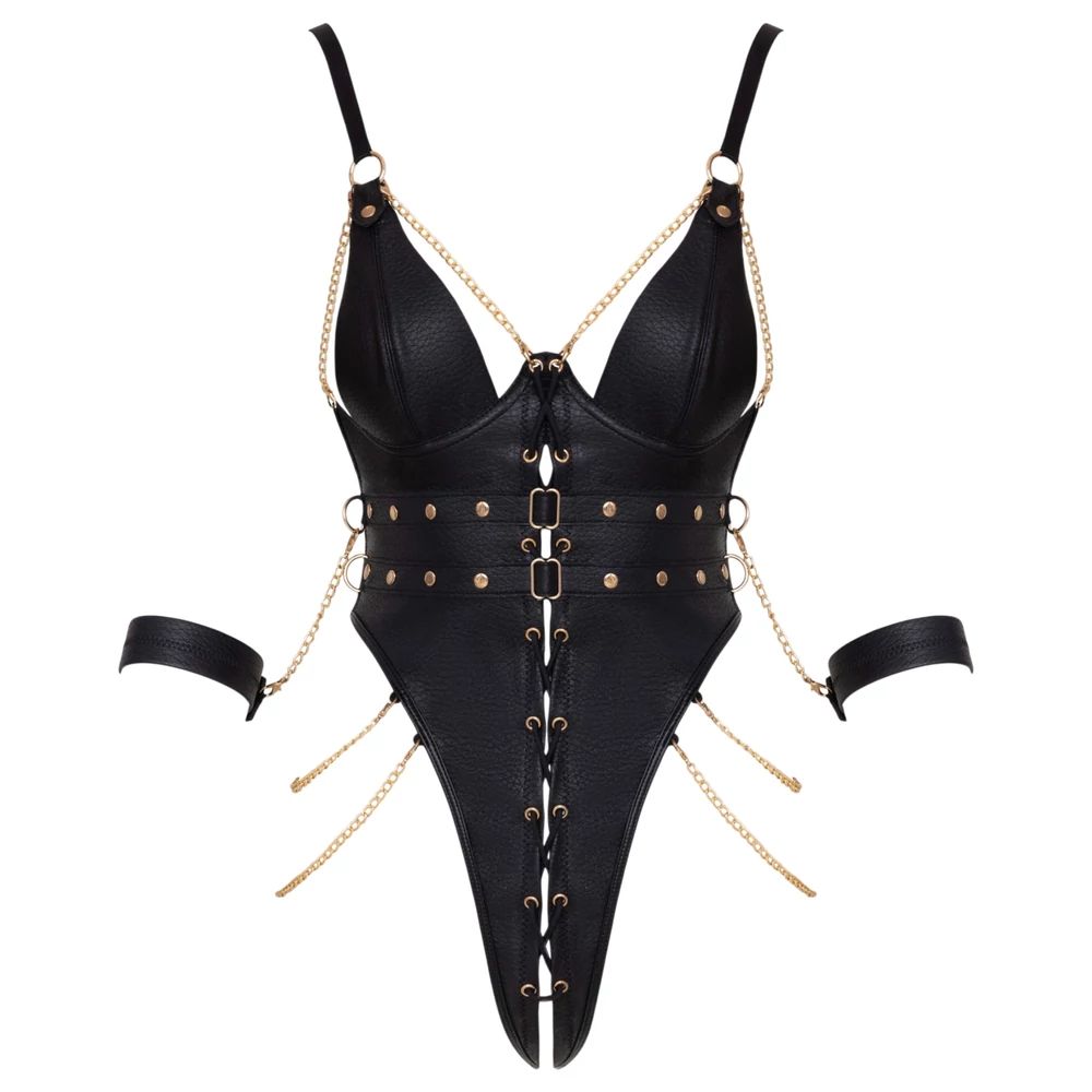 Ez a body nem egyszerűen szexi darab – hanem egy átgondoltan összerakott bondage szett egy ruhában. A puha, rugalmas műbőr anyag kényelmes viseletet biztosít, az arany színű láncocskák, gyűrűk és szegecsgombok pedig egyszerre dekoratívak és funkcionálisak. Az elején végigfutó fűzés, a levehető láncocskák és a két oldalt elhelyezett rögzítőgyűrűk gondoskodnak arról, hogy minden részletnek legyen értelme. A melltartórész kosárral és patenttal nyitható, az alj csípkés szabással crotchless kialakítású. A két puha kézmegkötöző karabinerrel csatlakozik az oldalsó gyűrűkhöz – gyorsan fel- és levehető, tépőzáras rögzítéssel.