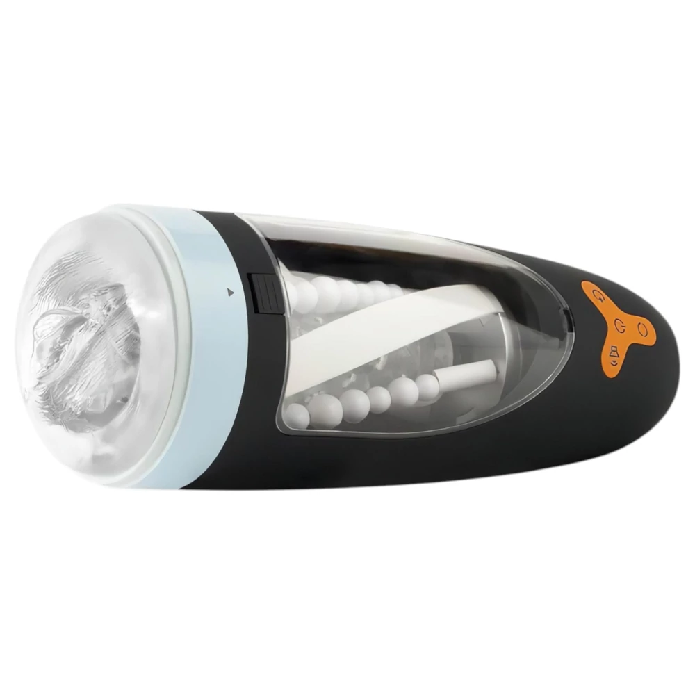 Akkumulátorral felszerelt, a péniszt körbe-körbe masszírozó forgó gyöngyök mellett, kellemes pénisz szívó élménnyel is kényeztető maszturbátor.