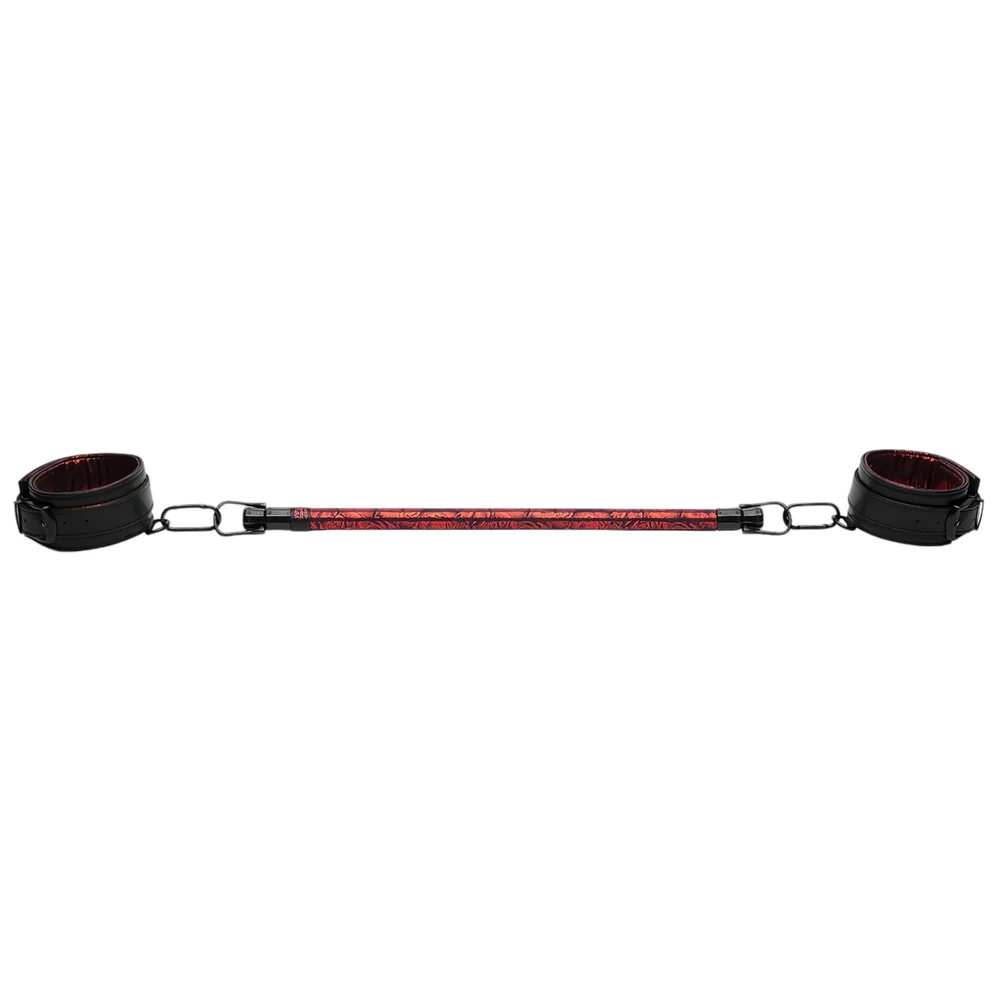 Szexi, vörös szatén borítású csuklóbilincs pár, hozzá illő terpesztő rúddal, amivel így partnered kezeit vagy lábait könnyen széttárásra kényszerítheted.