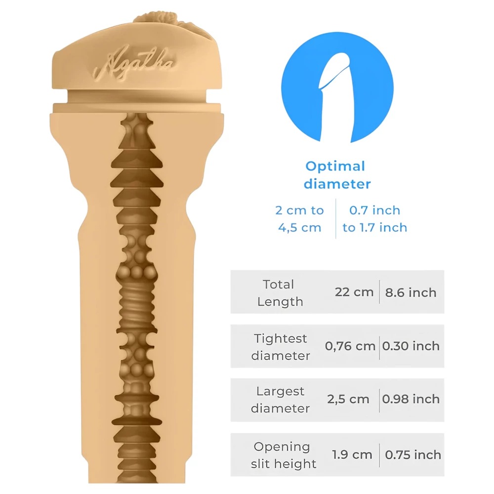 Ez a valósághű maszturbátor úgy lett megtervezve, hogy maximális élvezetet biztosítson minden alkalommal. A híres felnőttfilmes sztár, Agatha Vega intim formái alapján készült, így minden használatnál úgy érezheted, mintha vele lennél. A belső textúra rendkívül változatos és stimuláló, amely az orgazmusig vezető út minden pillanatát intenzívebbé teszi. Ha a legrealisztikusabb kézi élményre vágysz, ez a termék pontosan neked való!