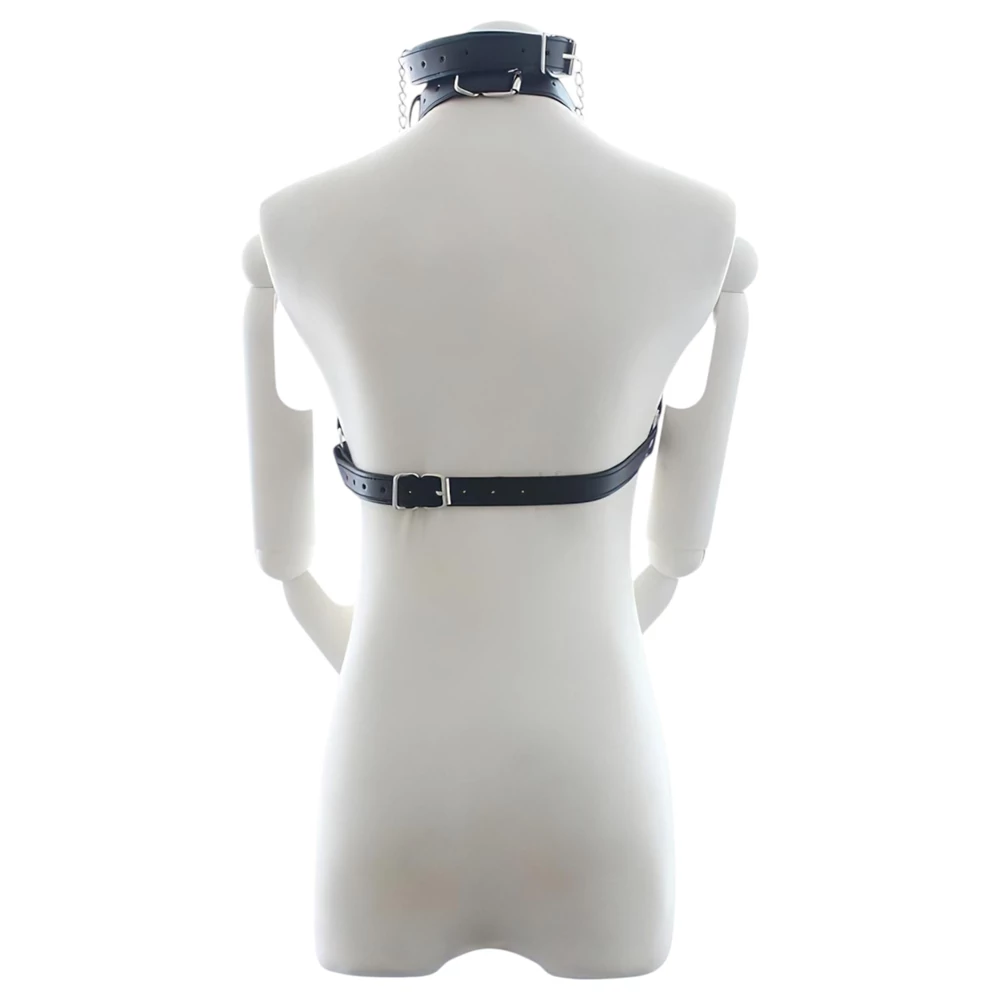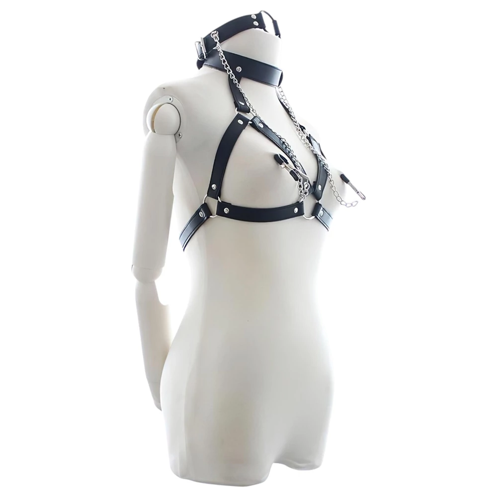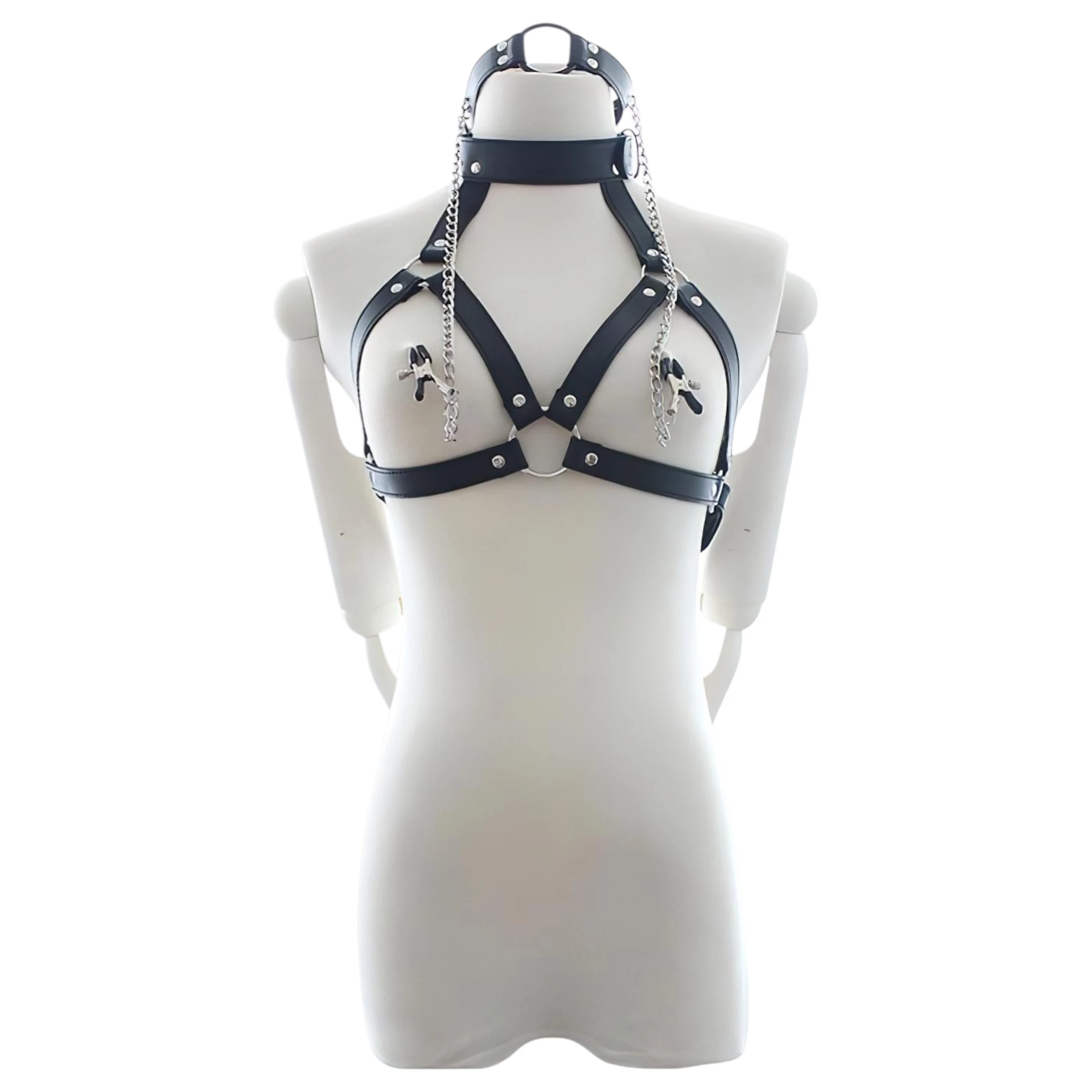 Ez a Latetobed BDSM kollekció egyik legkomplexebb és legizgalmasabb darabja, amely valódi élvezetet nyújt azoknak, akik szeretik a teljes kontrollt, alávetettséget és intenzív érzéki játékokat. A nyitott mellrészű hám háromszög formájú dizájnnal díszíti a testet, miközben nyakörvvel kapcsolódik össze, amelyhez egy O-gyűrűs szájpecek csatlakozik. A gyűrűből két láncon bimbócsipeszek lógnak, így minden mozdulat kétszeres stimulációt jelent.