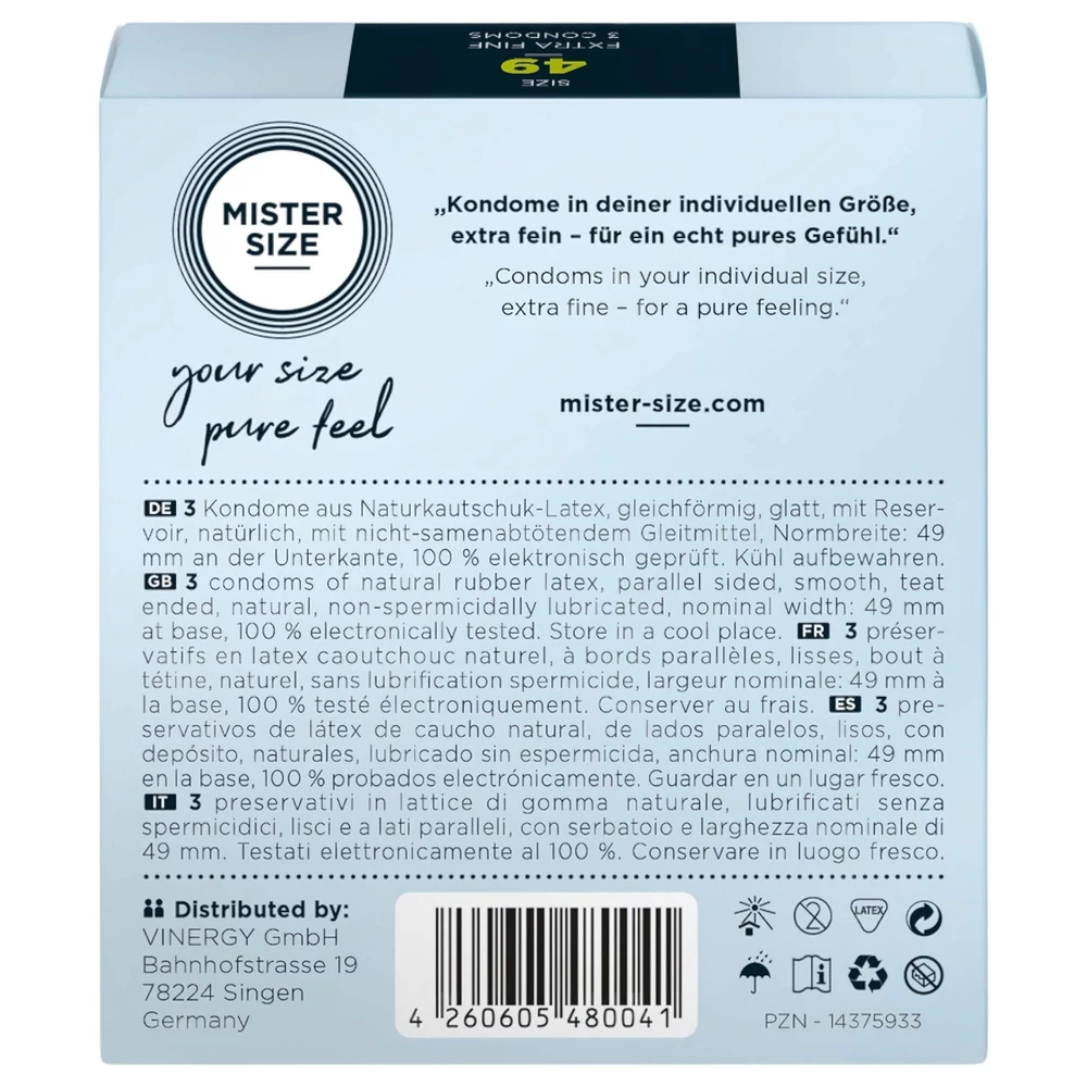 - 3 darab Mister Size óvszer 49 mm-es méretben, egyenként csomagolva.
