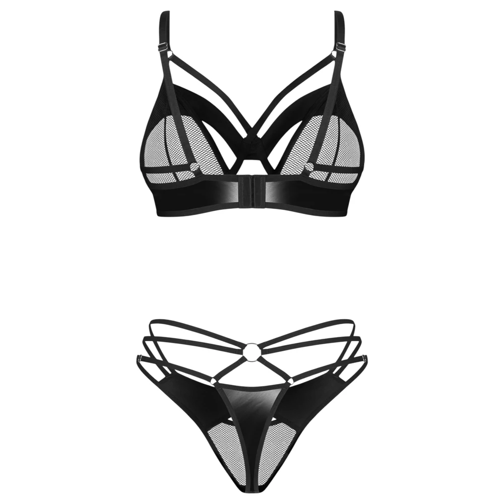 Az Obsessive Dominna – pántos melltartó szett (fekete) egy merész, modern és erotikus fehérnemű összeállítás, amely wetlook fényes anyagot és finom hálót kombinál extrém pántos dizájnnal.