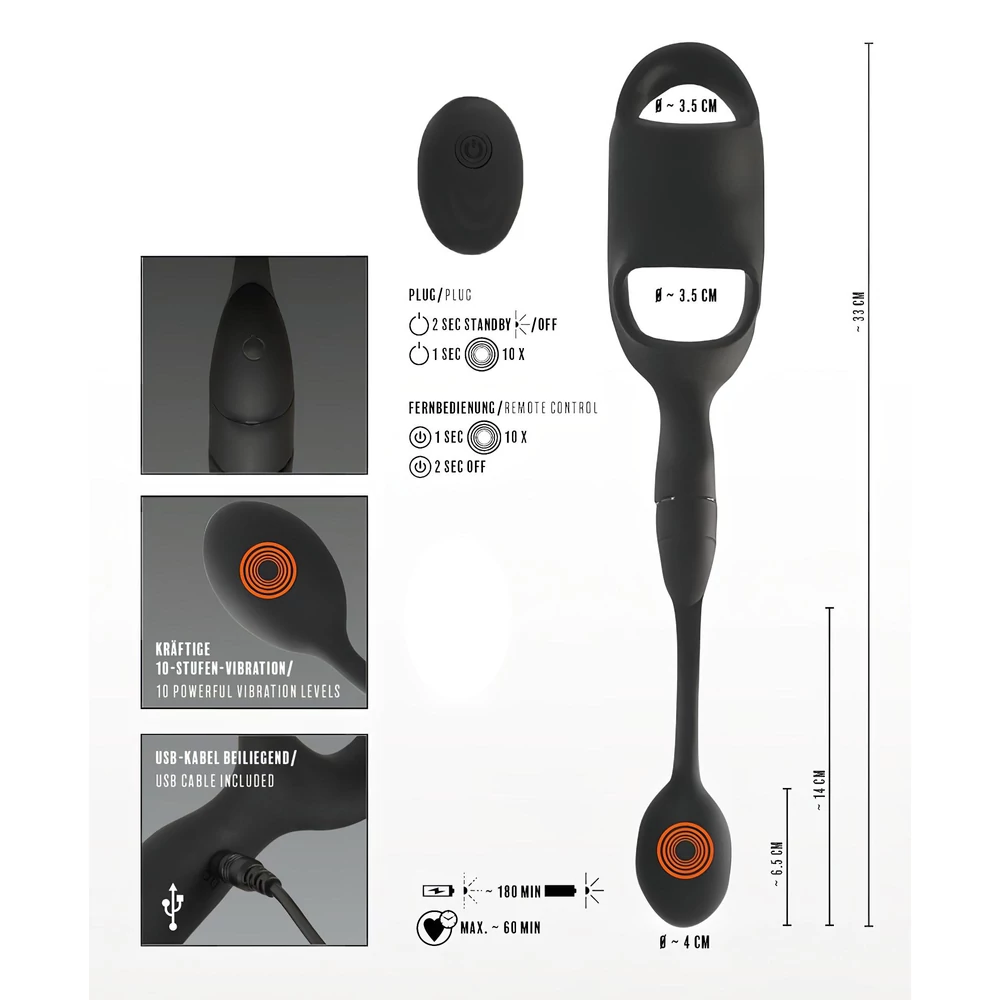 Csúsztasd fel a rugalmas pénisz- és heregyűrűket a péniszre és a herékre. Helyezd be a vibrátort megfelelő síkosítás után az ánuszba. Kapcsold be a vibrációs módokat a távirányító segítségével, és élvezd a változatos stimulációt. A gyűrűk szoros illeszkedése hosszabb erekciót biztosít, miközben az análdugó intenzíven masszírozza az anális területet.