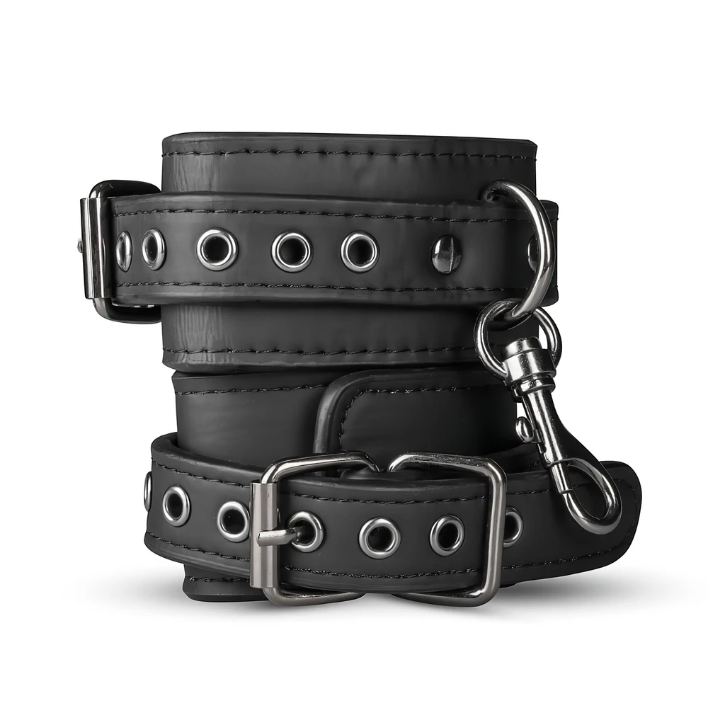 - Helyezd fel a csuklóbilincseket a partner csuklóira, és állítsd be a megfelelő méretre a fém csattal.