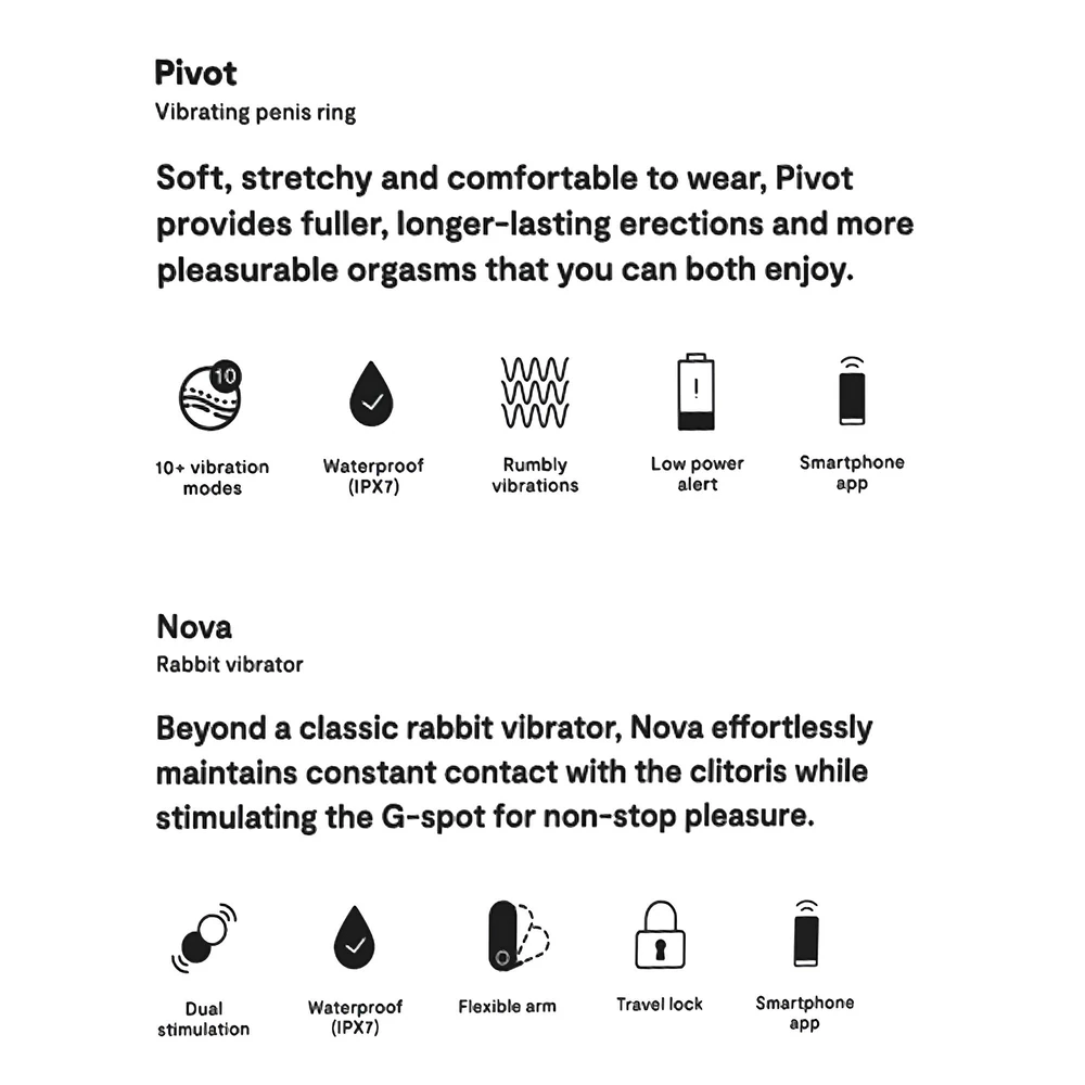 Ez a különleges páros csomag a We-Vibe két legismertebb modelljét egyesíti: a Pivot vibráló péniszgyűrűt és a Nova 2 csiklókaros vibrátort. Mindkét eszköz okostelefonról vezérelhető, így akár távolról is irányítható a rezgés, ami új dimenziókat nyit meg az intim játékok világában. A prémium szilikon, a halk működés, a 100%-os vízállóság és az ergonomikus kialakítás garantálják, hogy ez a szett hosszú távon is kedvenc marad – egyedül és együtt is.